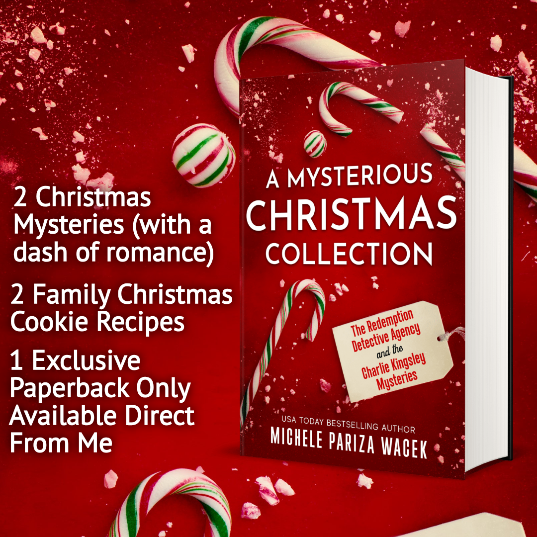 In this charming Christmas cozy mystery exclusive paperback edition, you get not one but TWO Christmas mysteries–one from the Charlie Kingsley Mystery series (Secret Santa Murder) and one from The Redemption Detective Agency (The Mysterious Case of the Dead Elf). Includes 2 family Christmas cookie recipes!